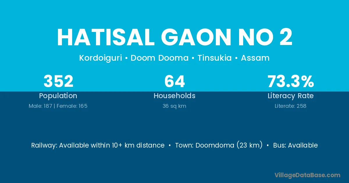 Doomdoma (23 km) is the nearest town to Hatisal Gaon No 2 village for major economic activities and is located approximately 23 km away.
