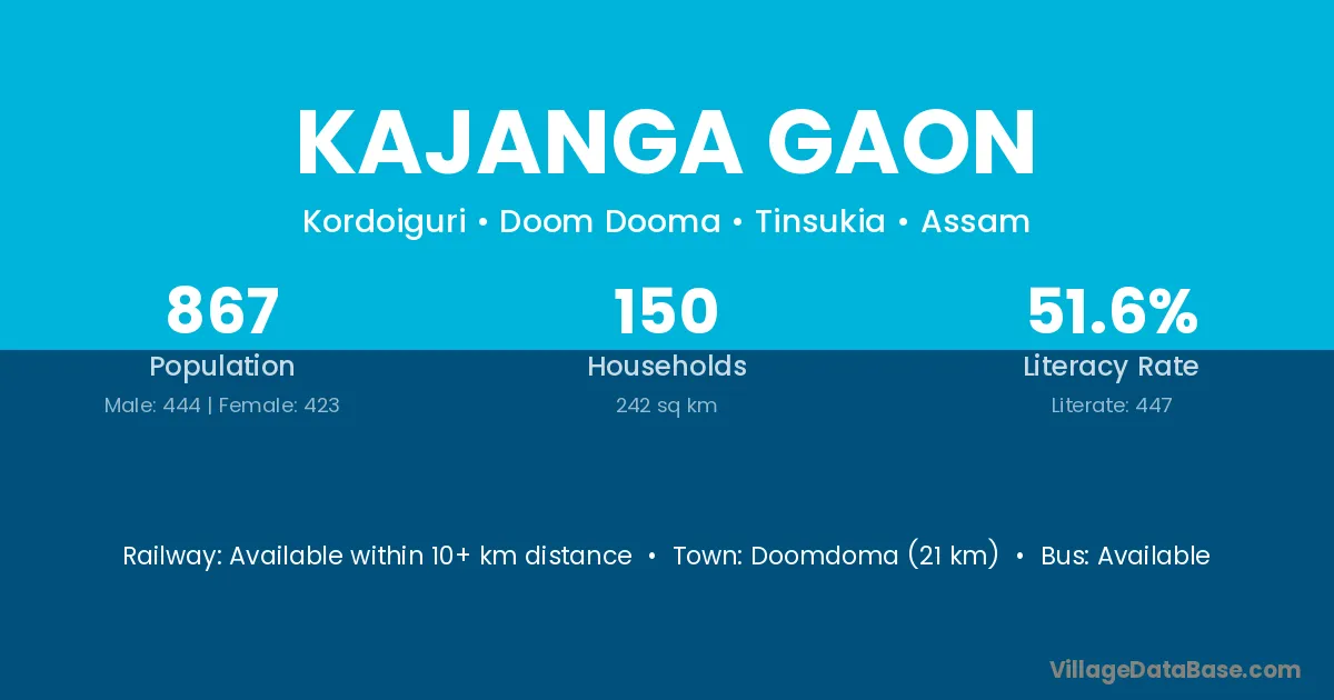 Kajanga Gaon village has a total population of 867 people, of which 444 are males and 423 are females.