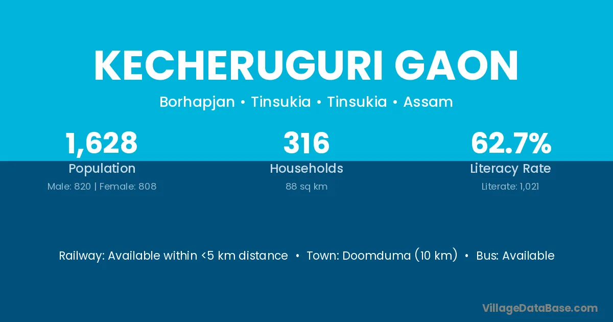 Doomdoma (14 km) is the nearest town to Kecheruguri Gaon village for major economic activities and is located approximately 14 km away.