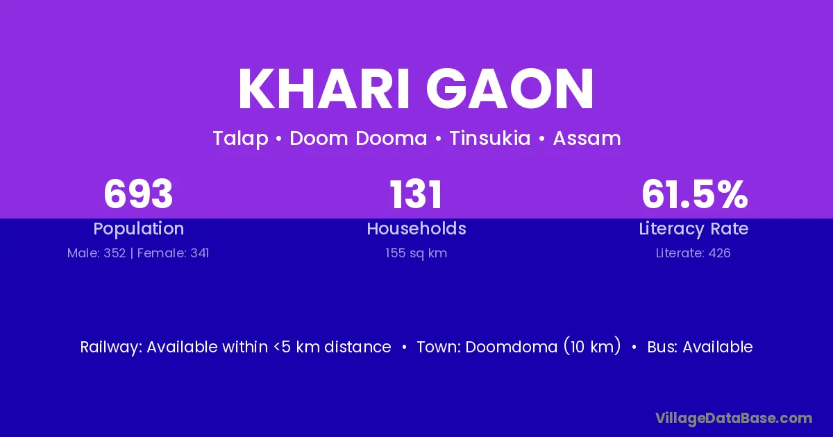 Doomdoma (10 km) is the nearest town to Khari Gaon village for major economic activities and is located approximately 10 km away.