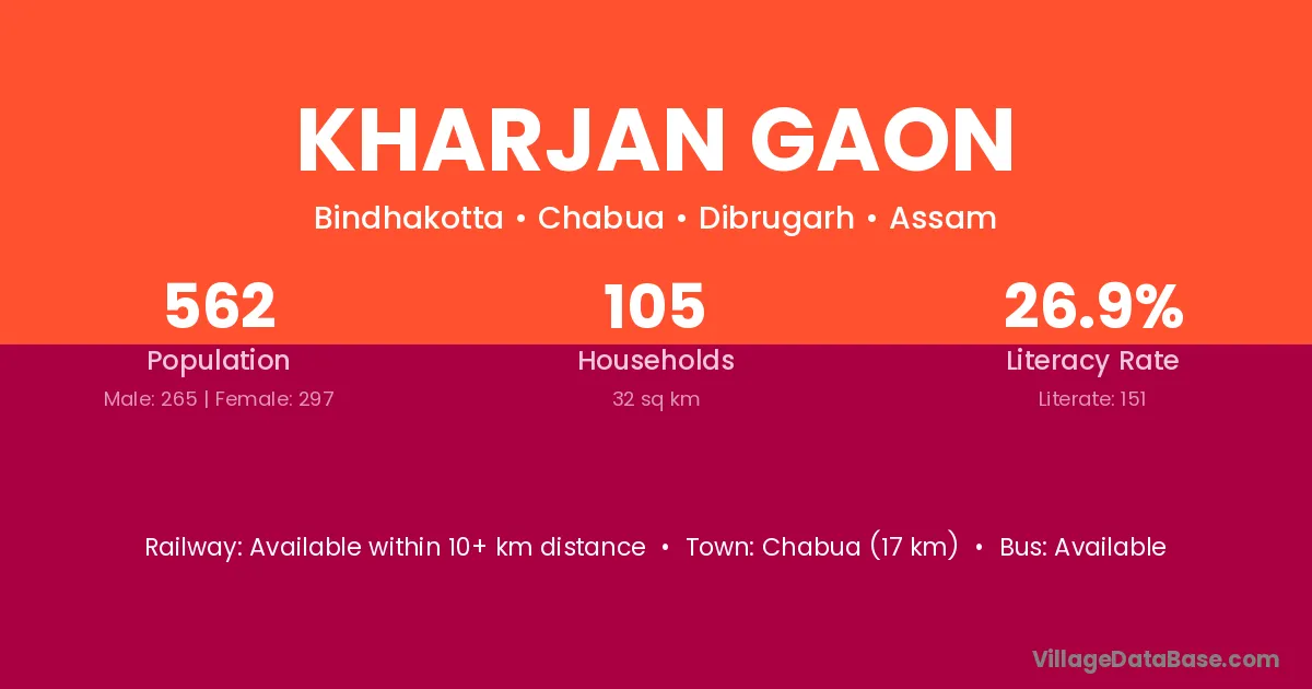 Doomdoma (15 km) is the nearest town to Kharjan Gaon village for major economic activities and is located approximately 15 km away.