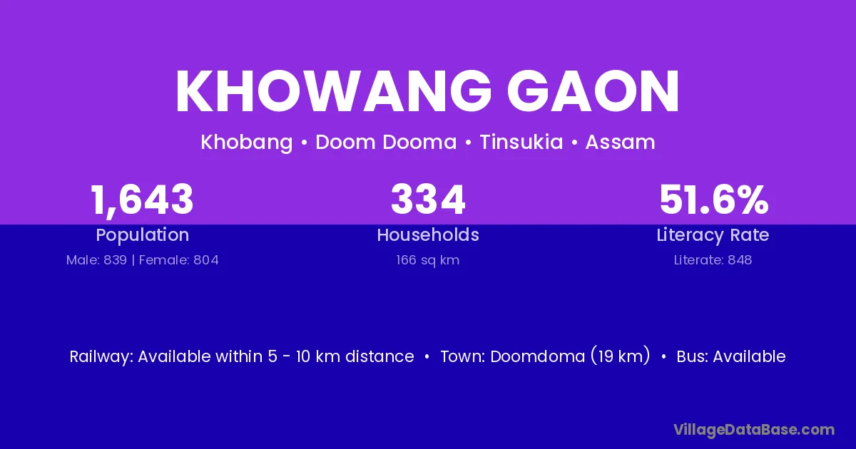 Doomdoma (19 km) is the nearest town to Khowang Gaon village for major economic activities and is located approximately 19 km away.