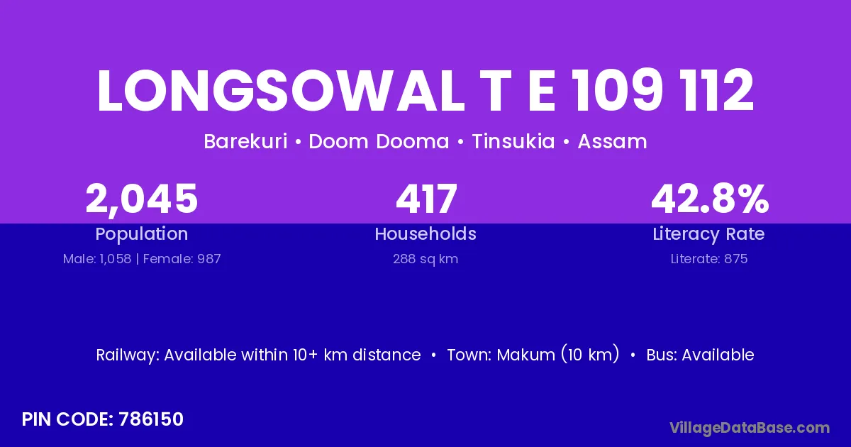 Makum (10 km) is the nearest town to Longsowal T E 109 112 village for major economic activities and is located approximately 10 km away.