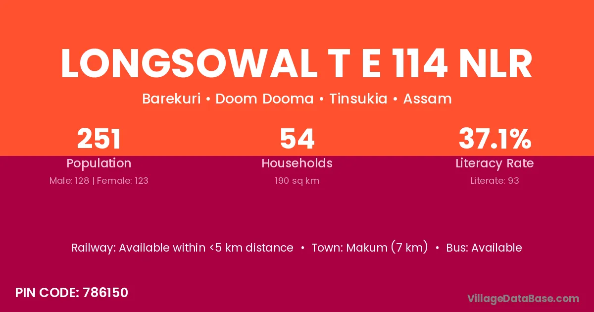 Makum (7 km) is the nearest town to Longsowal T E 114 Nlr village for major economic activities and is located approximately 7 km away.
