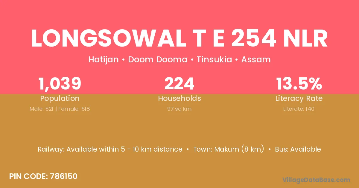Makum (8 km) is the nearest town to Longsowal T E 254 Nlr village for major economic activities and is located approximately 8 km away.