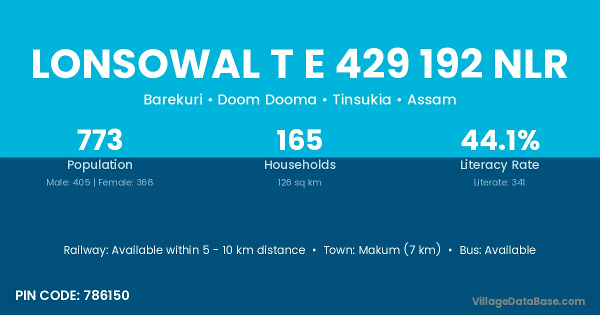 Makum (7 km) is the nearest town to Lonsowal T E 429 192 Nlr village for major economic activities and is located approximately 7 km away.