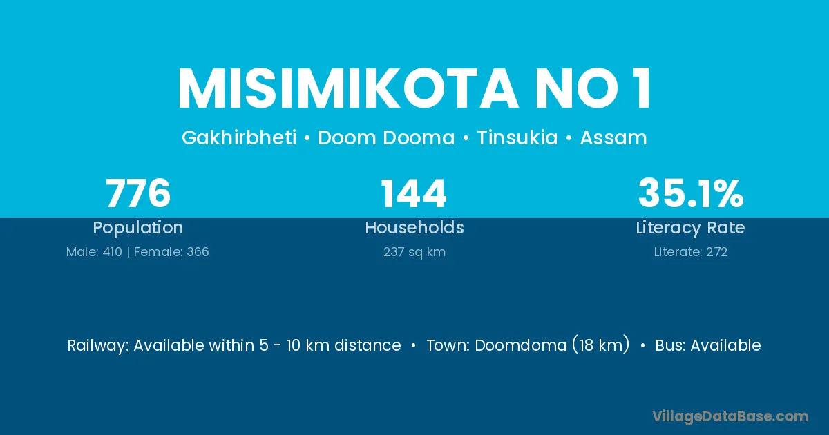 Misimikota No 1 village has a total population of 776 people, of which 410 are males and 366 are females.