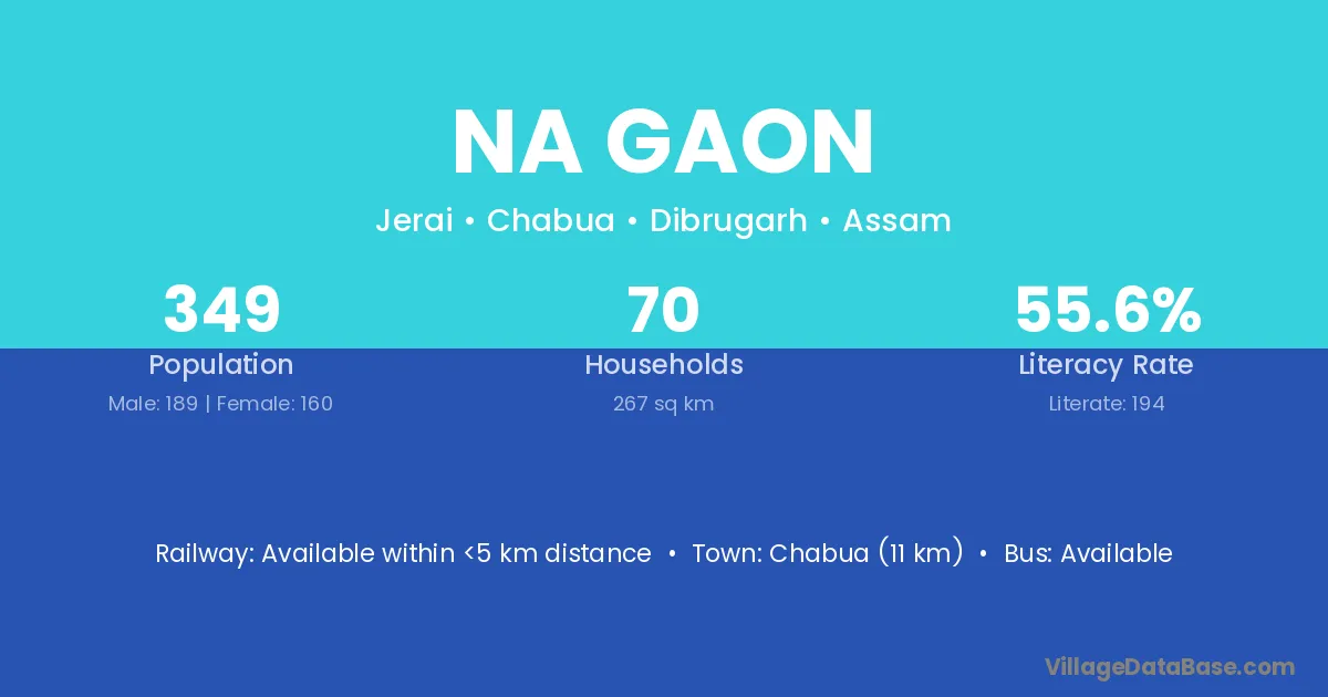 Doomdoma (17 km) is the nearest town to Na Gaon village for major economic activities and is located approximately 17 km away.