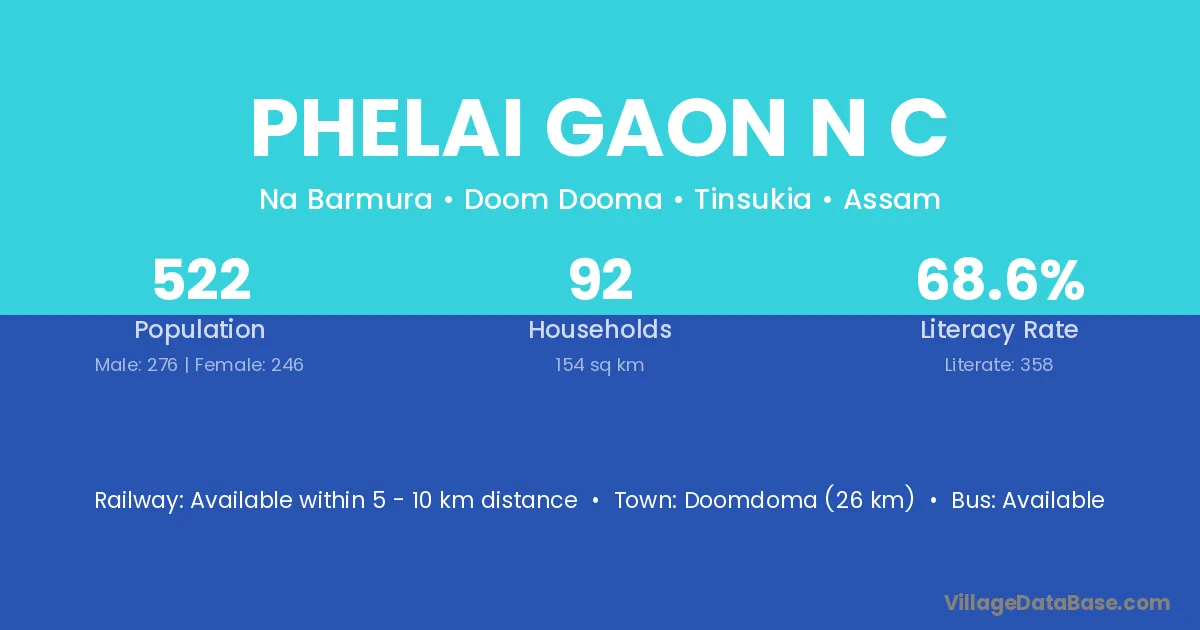 Doomdoma (26 km) is the nearest town to Phelai Gaon N C village for major economic activities and is located approximately 26 km away.