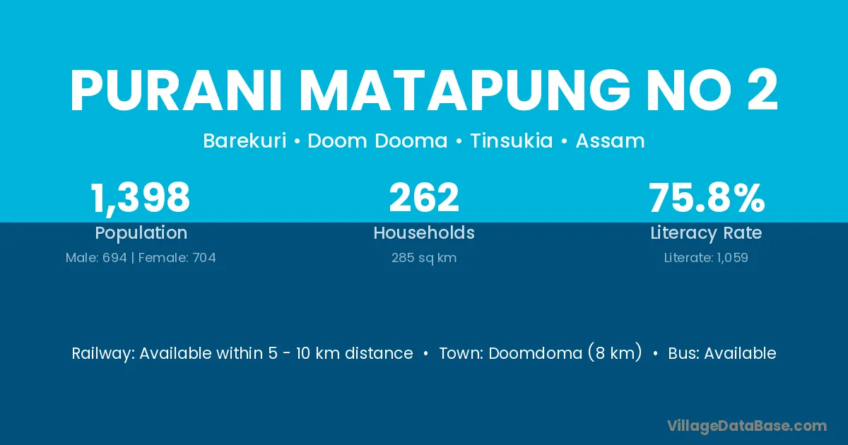 Doomdoma (8 km) is the nearest town to Purani Matapung No 2 village for major economic activities and is located approximately 8 km away.
