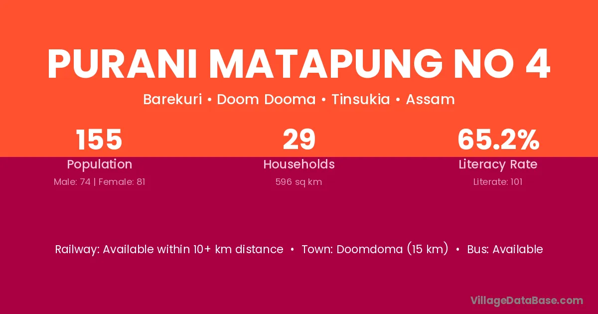 Doomdoma (15 km) is the nearest town to Purani Matapung No 4 village for major economic activities and is located approximately 15 km away.