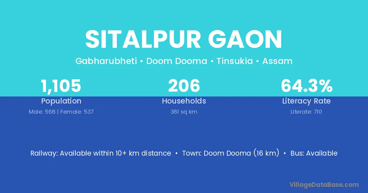 Doom Dooma (16 km) is the nearest town to Sitalpur Gaon village for major economic activities and is located approximately 16 km away.