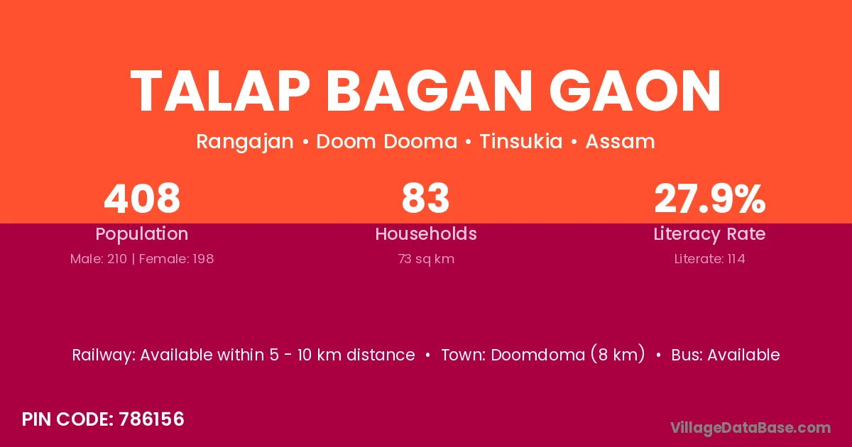 Talap Bagan Gaon village has a total population of 408 people, of which 210 are males and 198 are females.