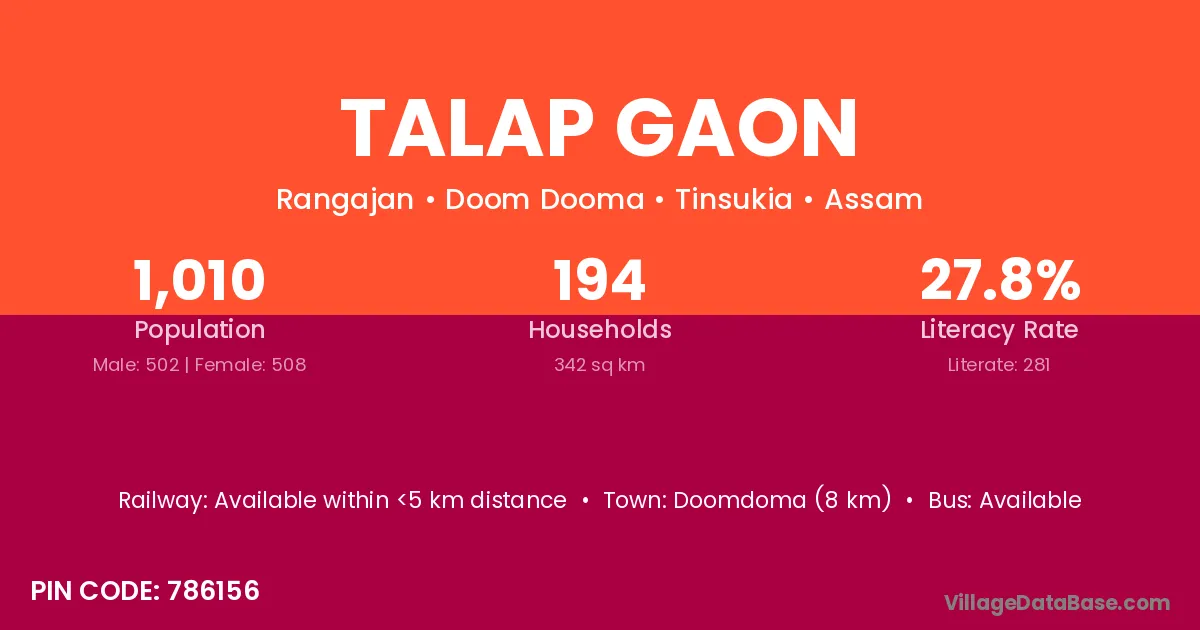Doomdoma (8 km) is the nearest town to Talap Gaon village for major economic activities and is located approximately 8 km away.