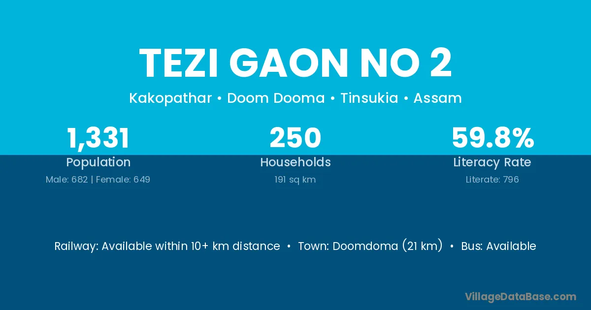 Doomdoma (21 km) is the nearest town to Tezi Gaon No 2 village for major economic activities and is located approximately 21 km away.