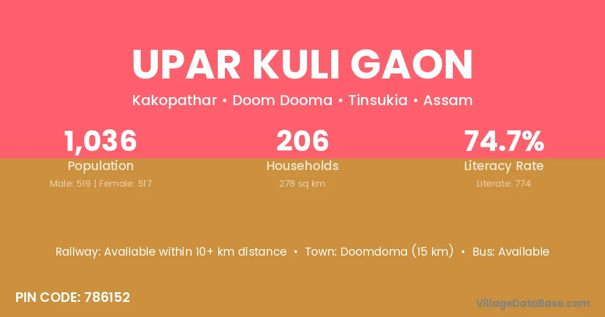Upar Kuli Gaon village has a total population of 1,036 people, of which 519 are males and 517 are females.