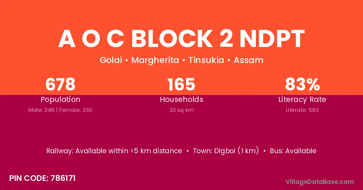 Digboi (1 km) is the nearest town to A O C Block 2 Ndpt village for major economic activities and is located approximately 1 km away.