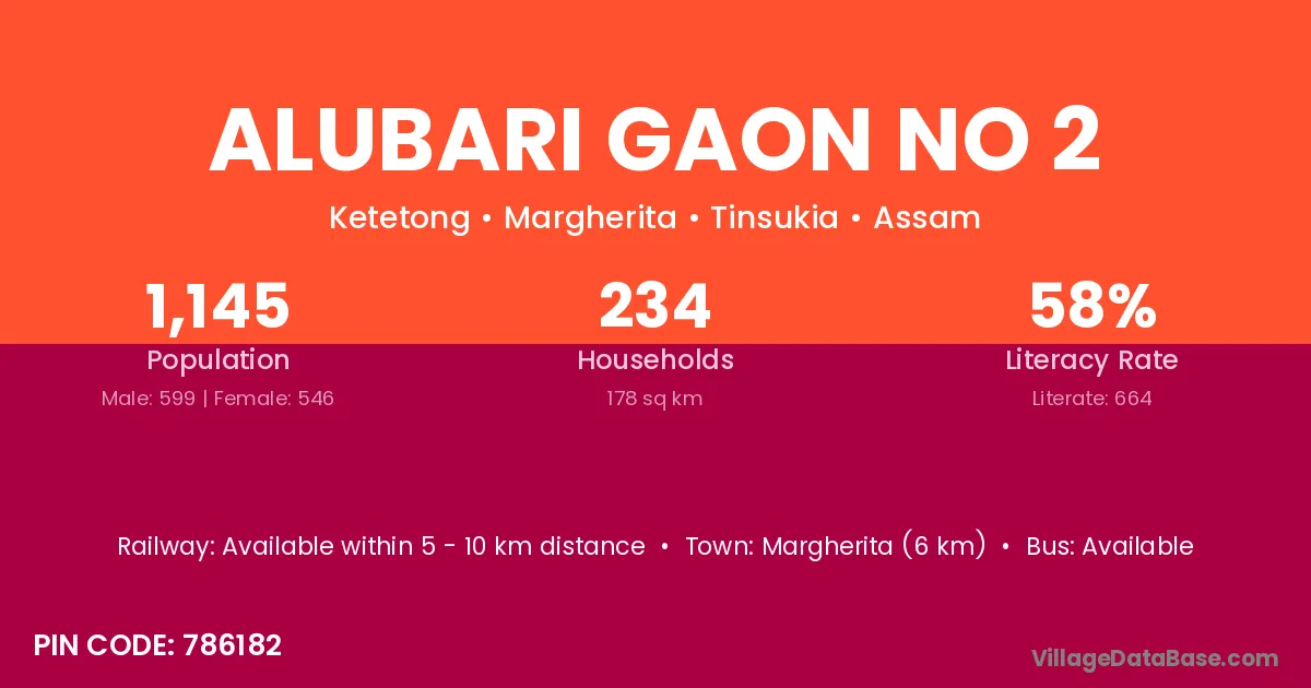 Margherita (6 km) is the nearest town to Alubari Gaon No 2 village for major economic activities and is located approximately 6 km away.