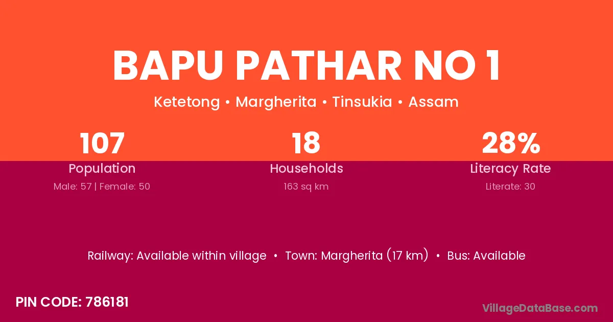 Margherita (17 km) is the nearest town to Bapu Pathar No 1 village for major economic activities and is located approximately 17 km away.