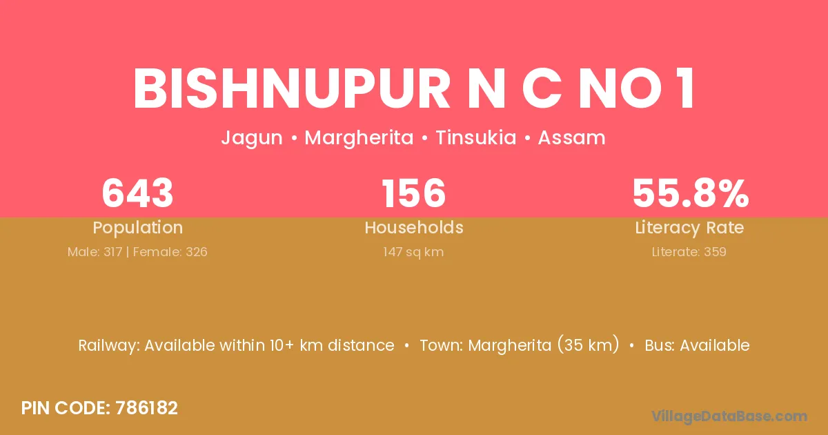 Margherita (35 km) is the nearest town to Bishnupur N C No 1 village for major economic activities and is located approximately 35 km away.