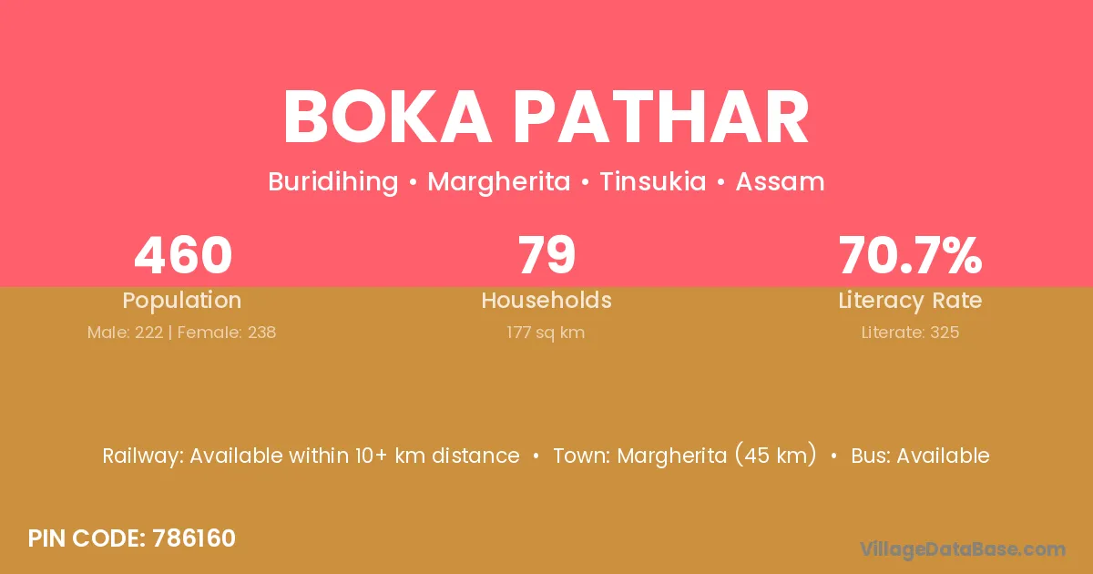 Margherita (45 km) is the nearest town to Boka Pathar village for major economic activities and is located approximately 45 km away.