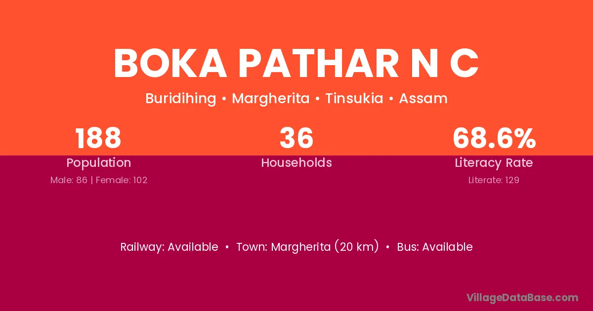 Margherita (20 km) is the nearest town to Boka Pathar N C village for major economic activities and is located approximately 20 km away.