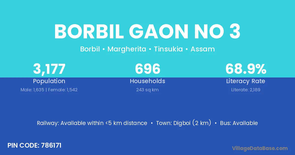 Borbil Gaon No 3 village has a total population of 3,177 people, of which 1,635 are males and 1,542 are females.