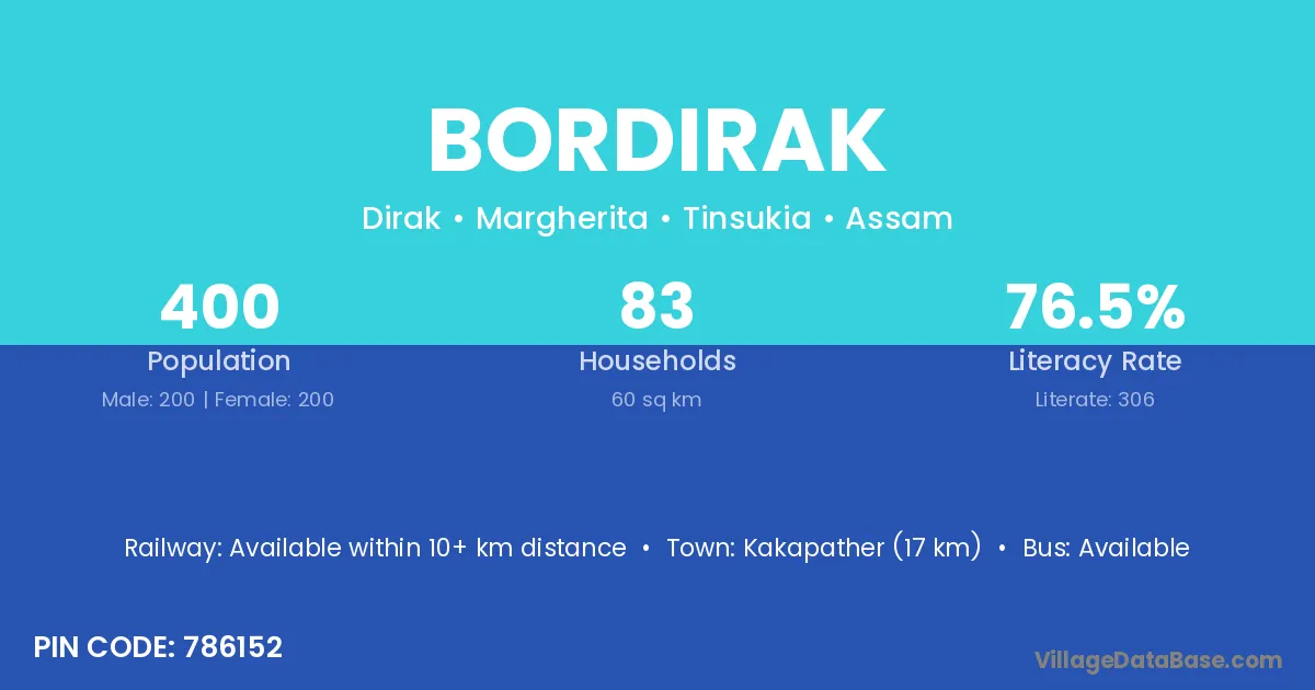 Kakapather (17 km) is the nearest town to Bordirak village for major economic activities and is located approximately 17 km away.