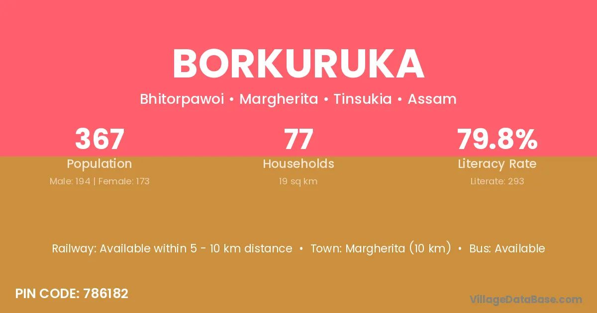 Margherita (10 km) is the nearest town to Borkuruka village for major economic activities and is located approximately 10 km away.