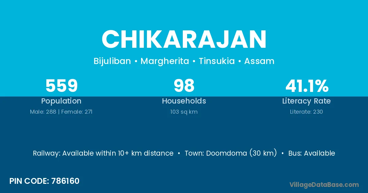 Doomdoma (30 km) is the nearest town to Chikarajan village for major economic activities and is located approximately 30 km away.