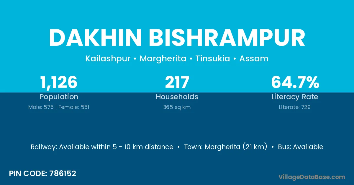 Margherita (21 km) is the nearest town to Dakhin Bishrampur village for major economic activities and is located approximately 21 km away.