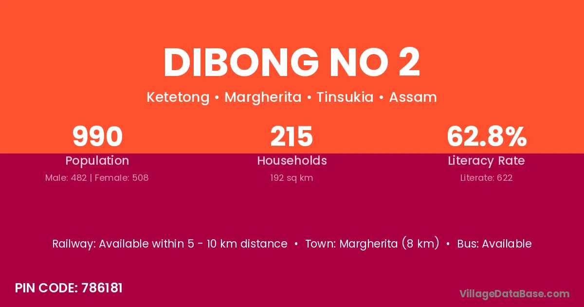 Margherita (8 km) is the nearest town to Dibong No 2 village for major economic activities and is located approximately 8 km away.