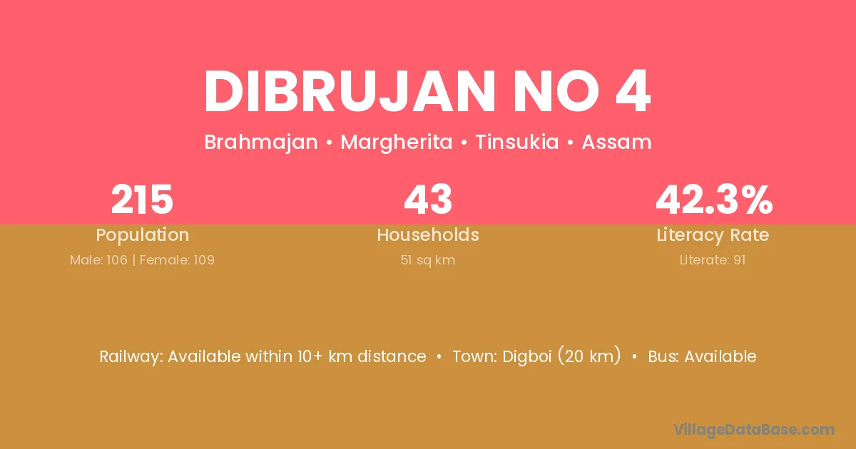 Dibrujan No 4 village has a total population of 215 people, of which 106 are males and 109 are females.