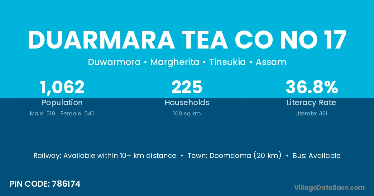 Doomdoma (20 km) is the nearest town to Duarmara Tea Co No 17 village for major economic activities and is located approximately 20 km away.