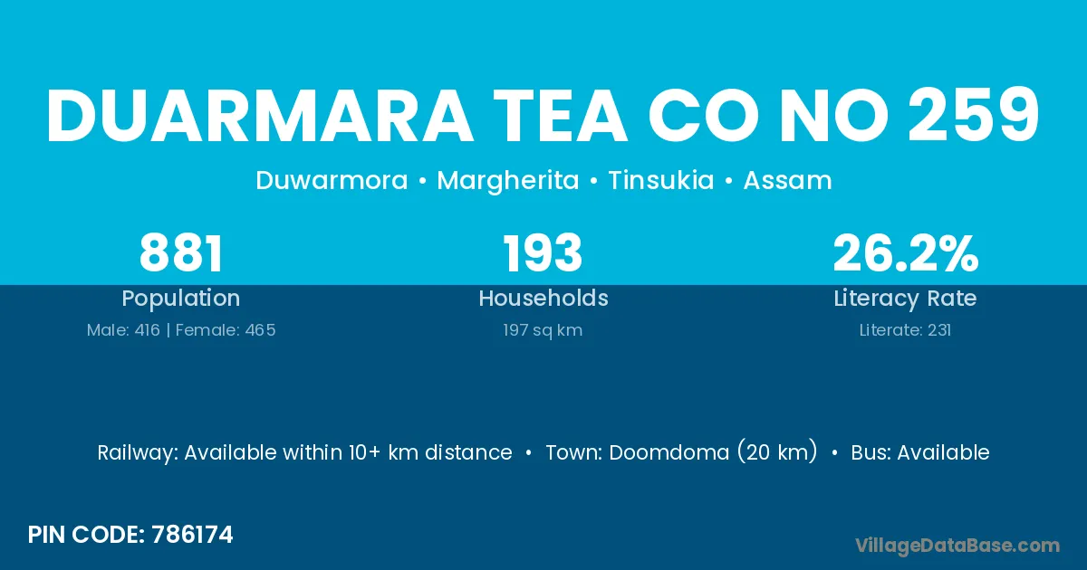 Doomdoma (20 km) is the nearest town to Duarmara Tea Co No 259 village for major economic activities and is located approximately 20 km away.