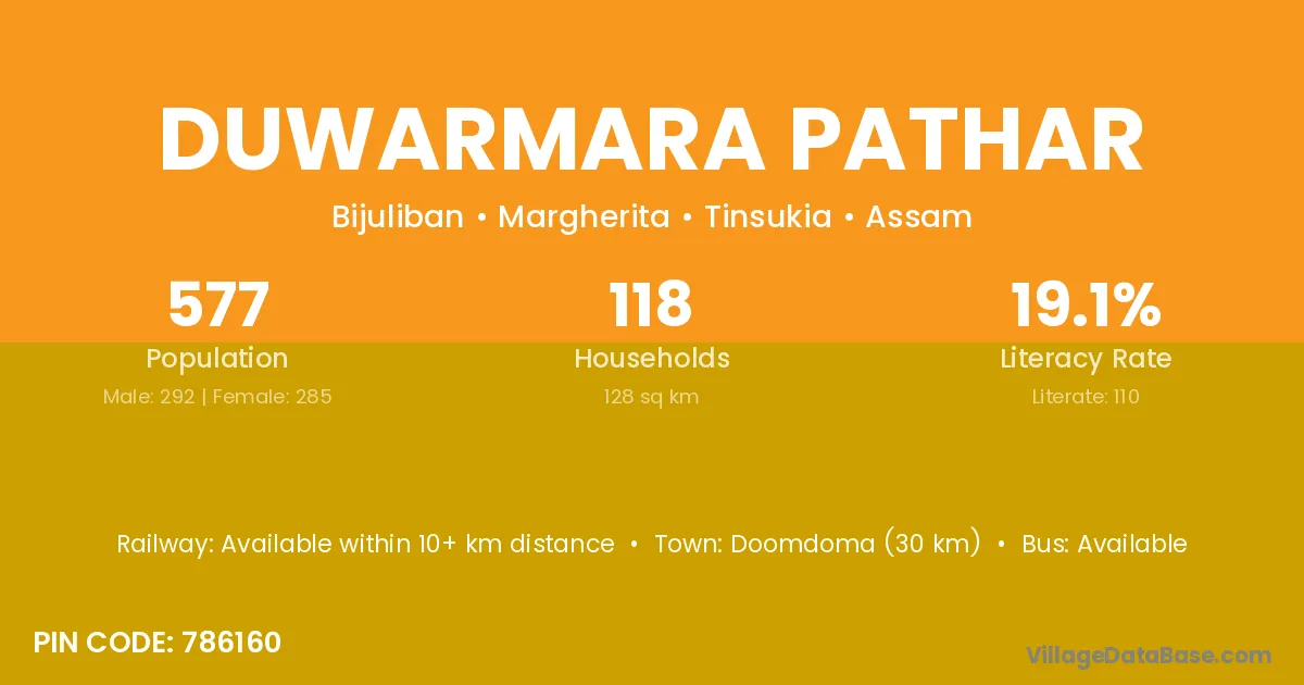 Duwarmara Pathar village has a total population of 577 people, of which 292 are males and 285 are females.
