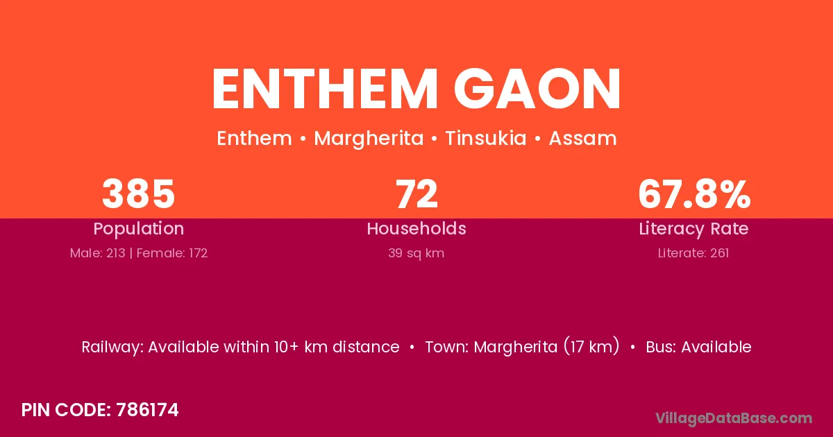 Margherita (17 km) is the nearest town to Enthem Gaon village for major economic activities and is located approximately 17 km away.