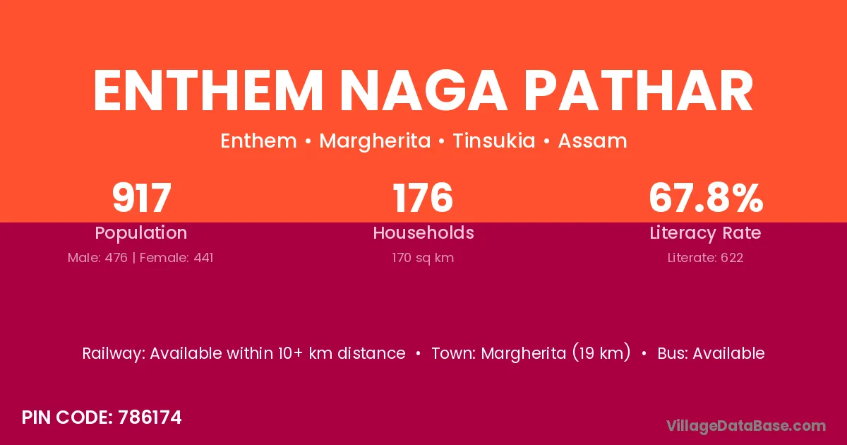 Margherita (19 km) is the nearest town to Enthem Naga Pathar village for major economic activities and is located approximately 19 km away.