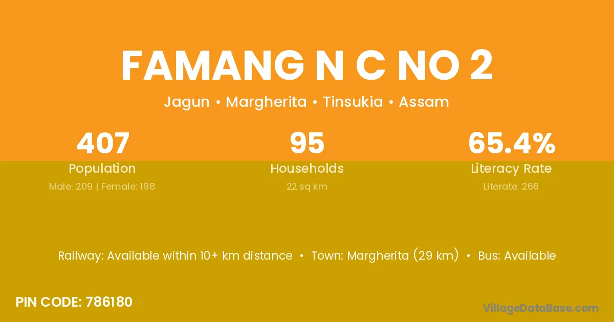 Margherita (29 km) is the nearest town to Famang N C No 2 village for major economic activities and is located approximately 29 km away.