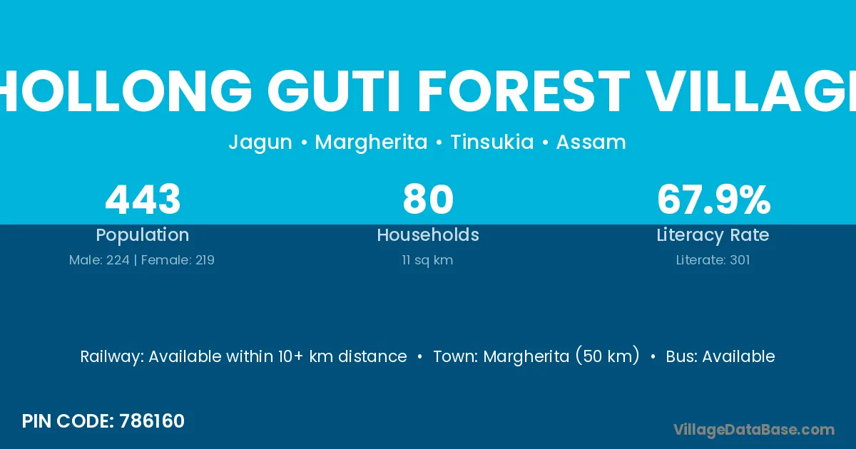 Hollong Guti Forest Village village has a total population of 443 people, of which 224 are males and 219 are females.