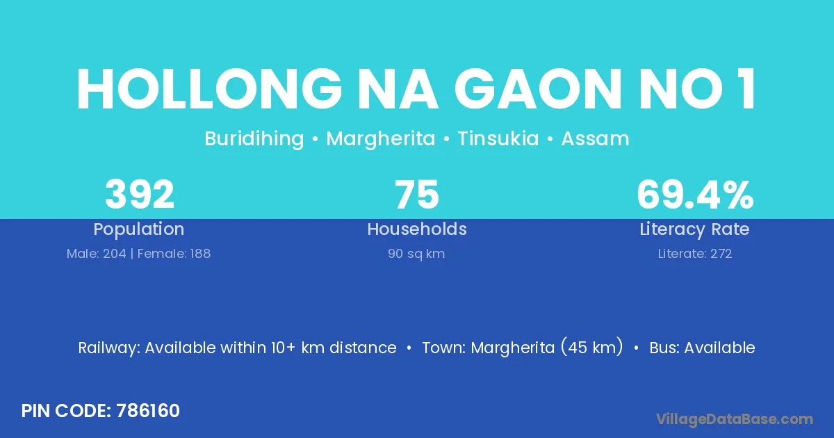Margherita (45 km) is the nearest town to Hollong Na Gaon No 1 village for major economic activities and is located approximately 45 km away.