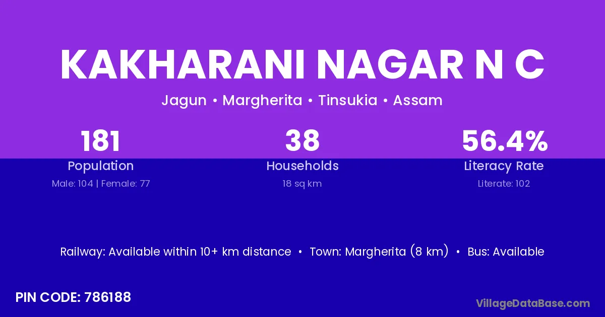 Margherita (8 km) is the nearest town to Kakharani Nagar N C village for major economic activities and is located approximately 8 km away.