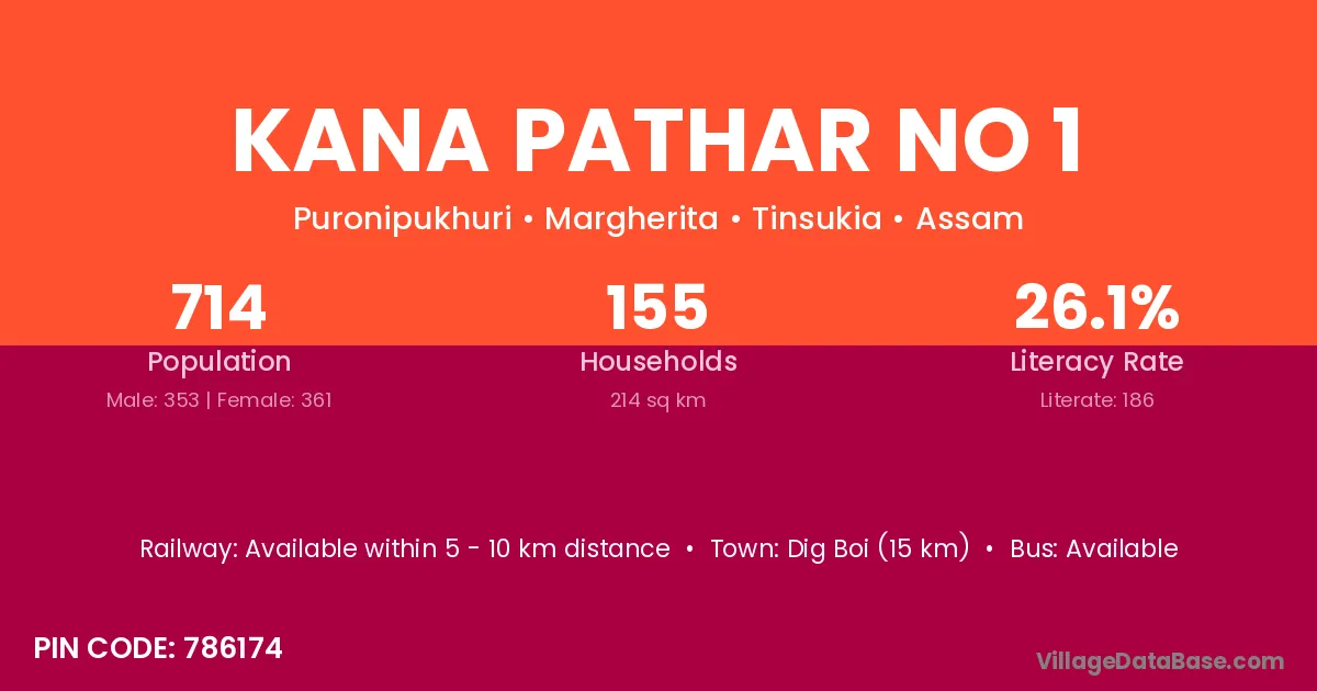 Dig Boi (15 km) is the nearest town to Kana Pathar No 1 village for major economic activities and is located approximately 15 km away.
