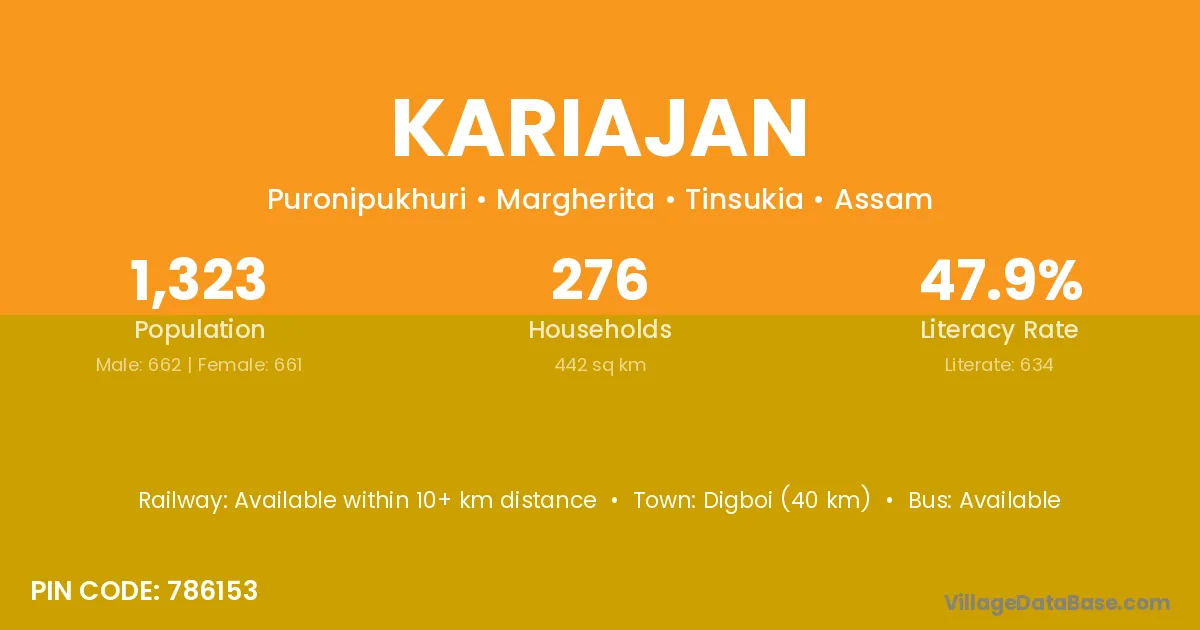 Digboi (40 km) is the nearest town to Kariajan village for major economic activities and is located approximately 40 km away.