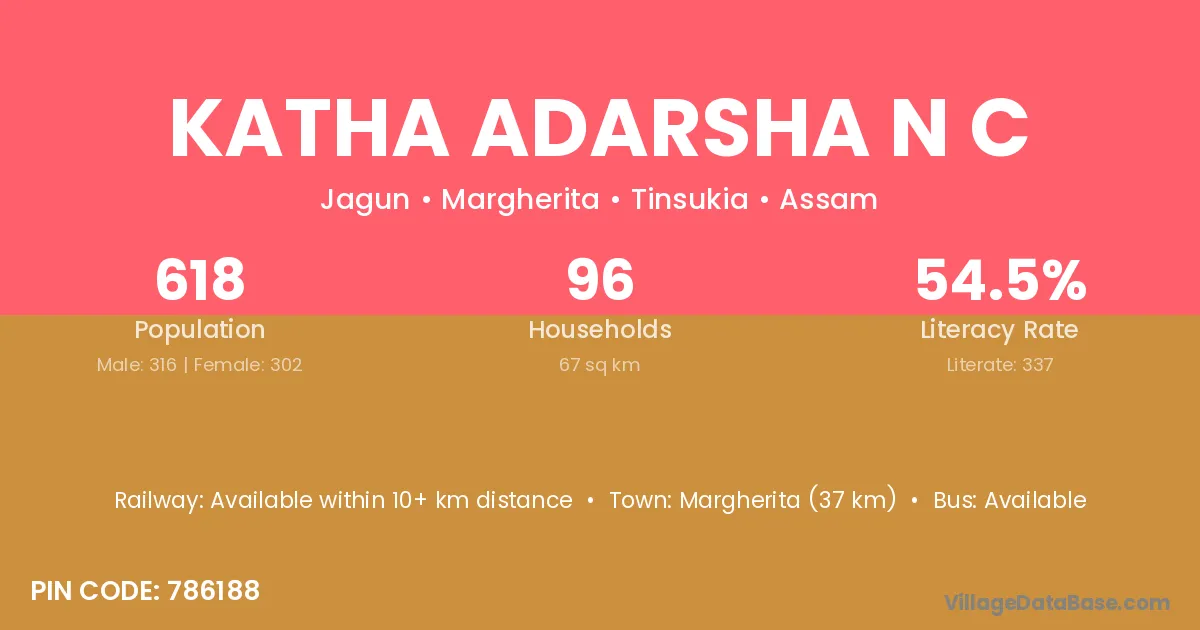 Margherita (37 km) is the nearest town to Katha Adarsha N C village for major economic activities and is located approximately 37 km away.