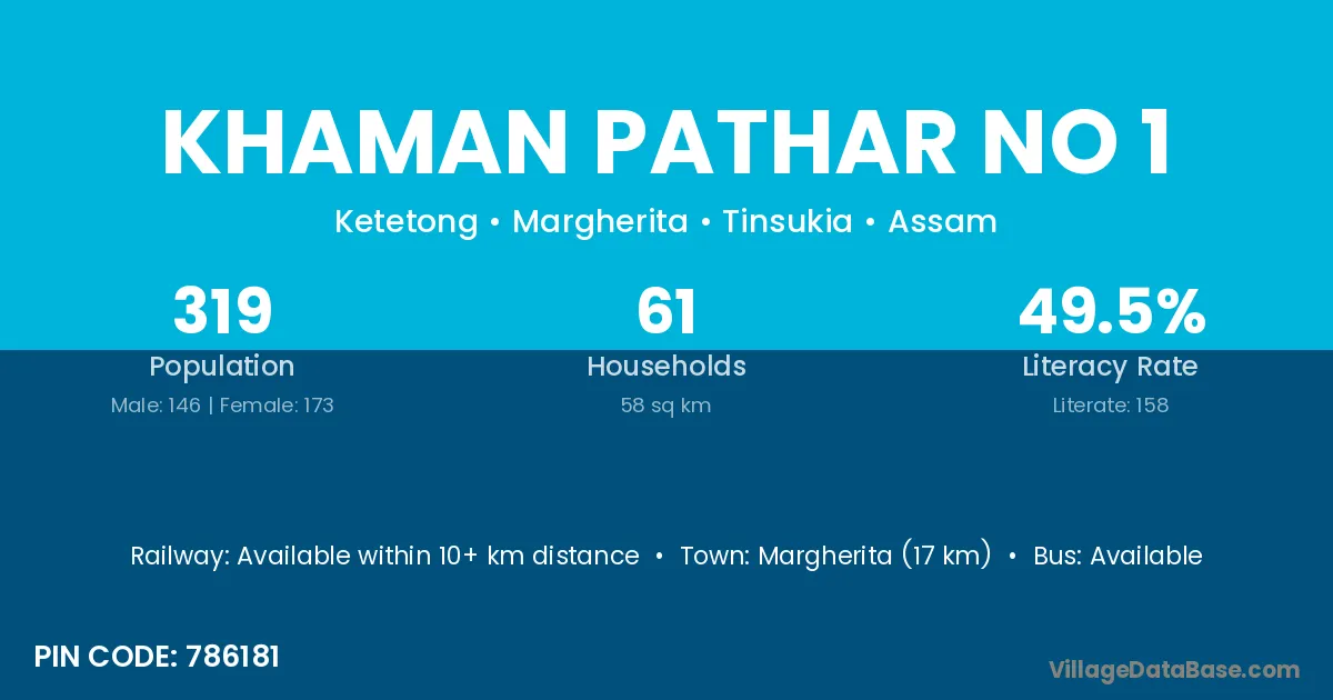 Margherita (17 km) is the nearest town to Khaman Pathar No 1 village for major economic activities and is located approximately 17 km away.