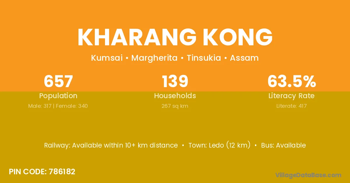 Ledo (12 km) is the nearest town to Kharang Kong village for major economic activities and is located approximately 12 km away.