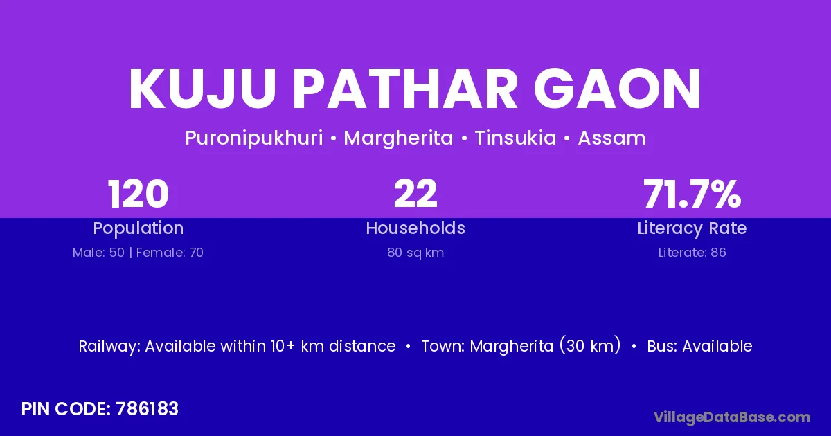 Margherita (30 km) is the nearest town to Kuju Pathar Gaon village for major economic activities and is located approximately 30 km away.