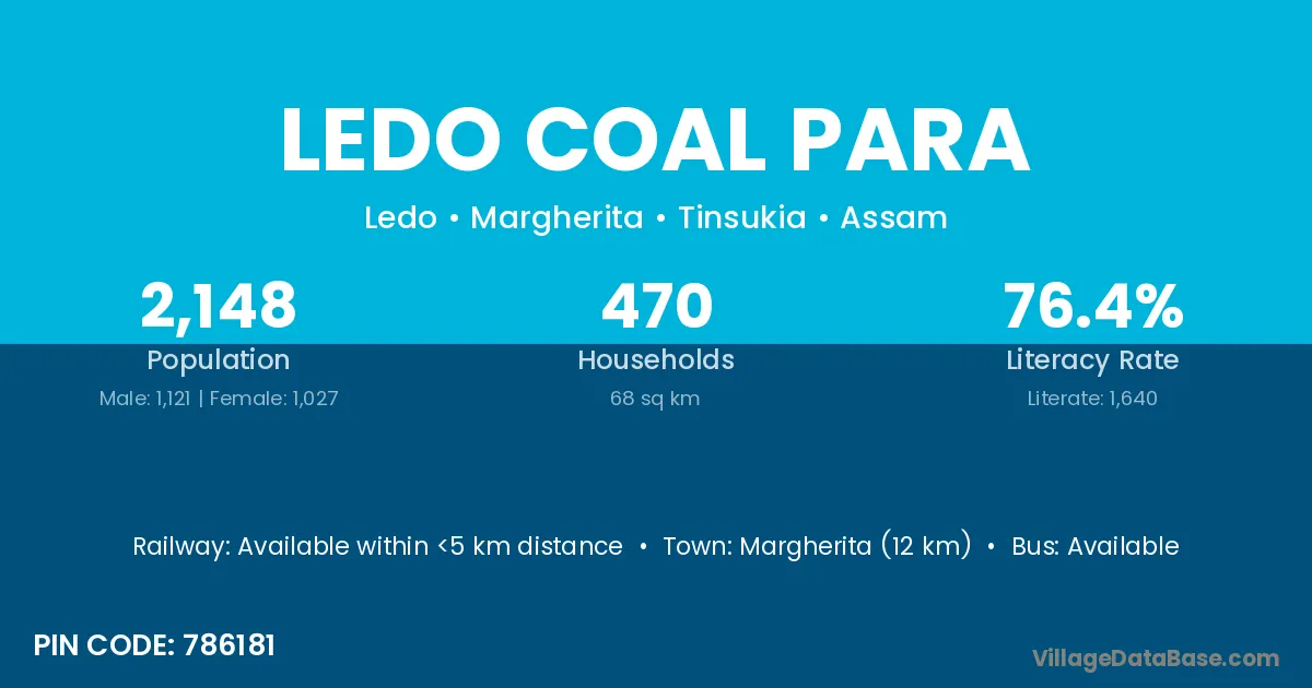 Margherita (12 km) is the nearest town to Ledo Coal Para village for major economic activities and is located approximately 12 km away.
