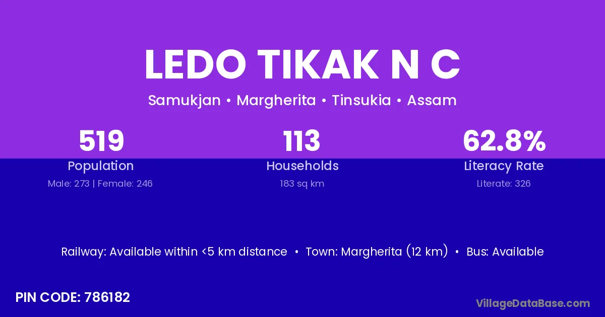 Margherita (12 km) is the nearest town to Ledo Tikak N C village for major economic activities and is located approximately 12 km away.
